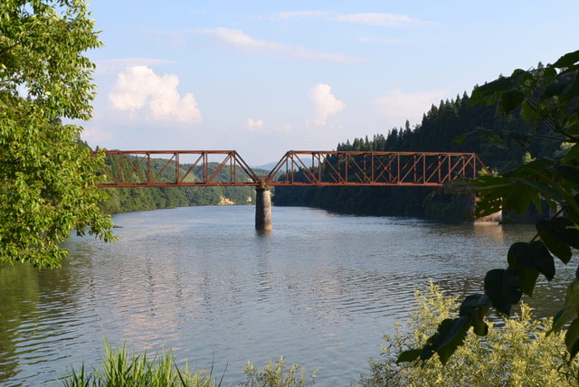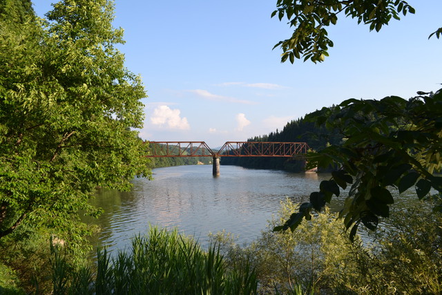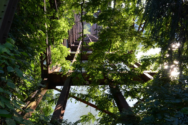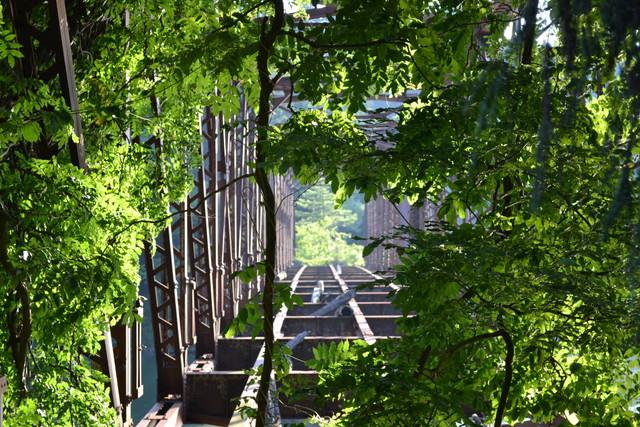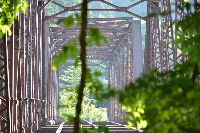 木々の木漏れ日の間からそいつは出てきた。骨組みだけである。こんな間近で鉄骨むき出しの美しいトラス橋が見ることができるとは。暫しそこに佇むこととした。