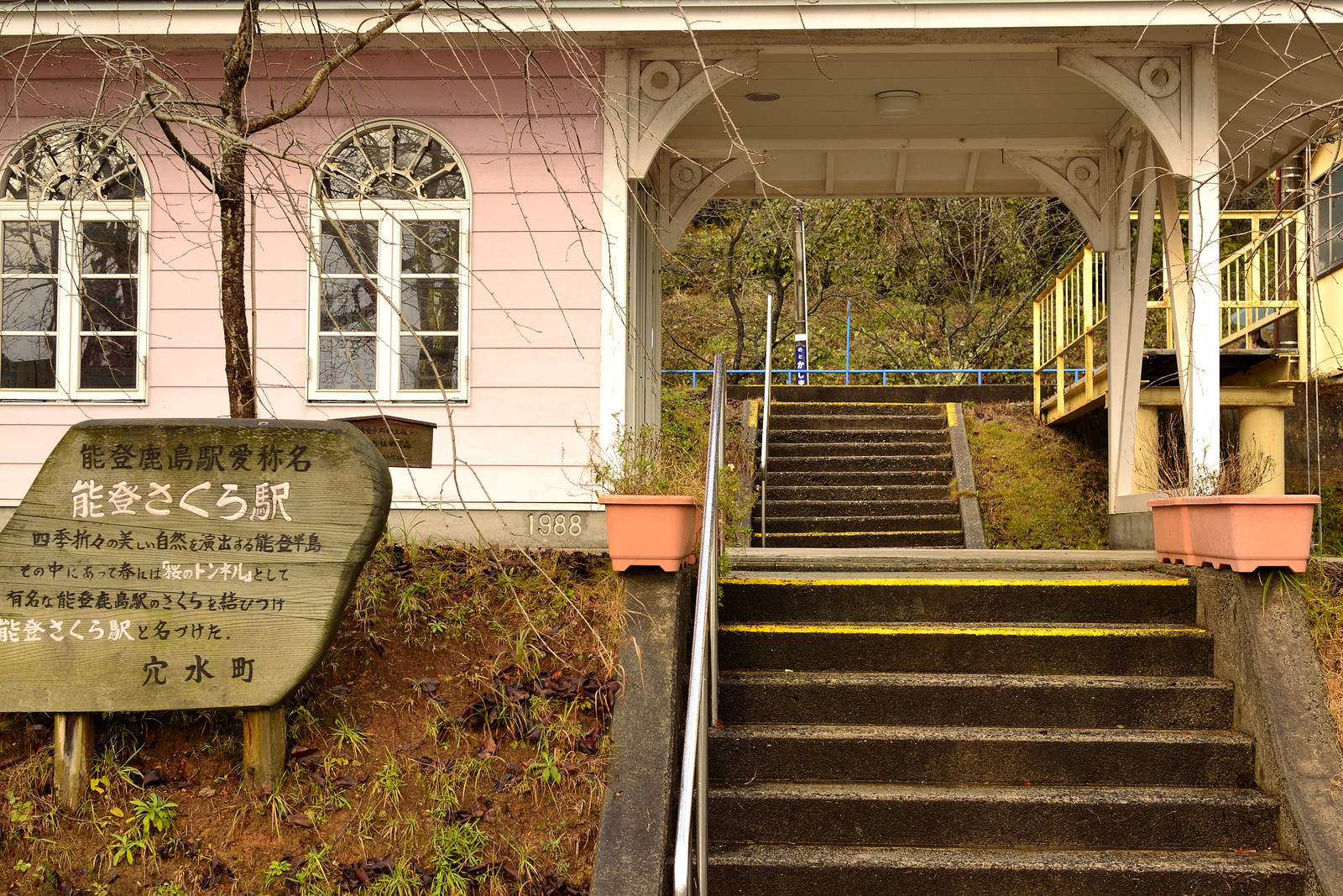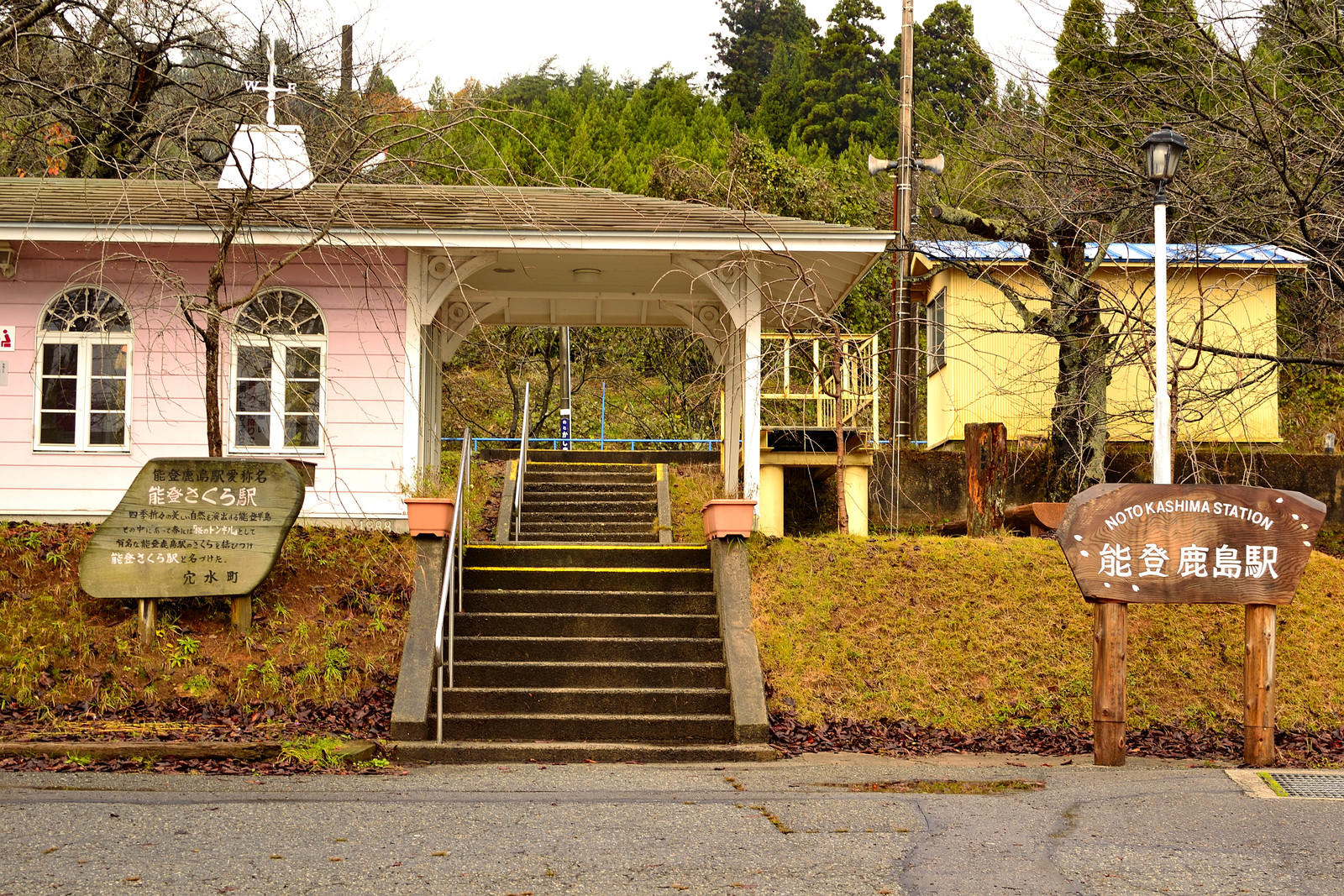 雨はやんだので適当に散策すると、駅構内には桜の木がたくさんありました。桜の咲く季節にまた訪れたい。