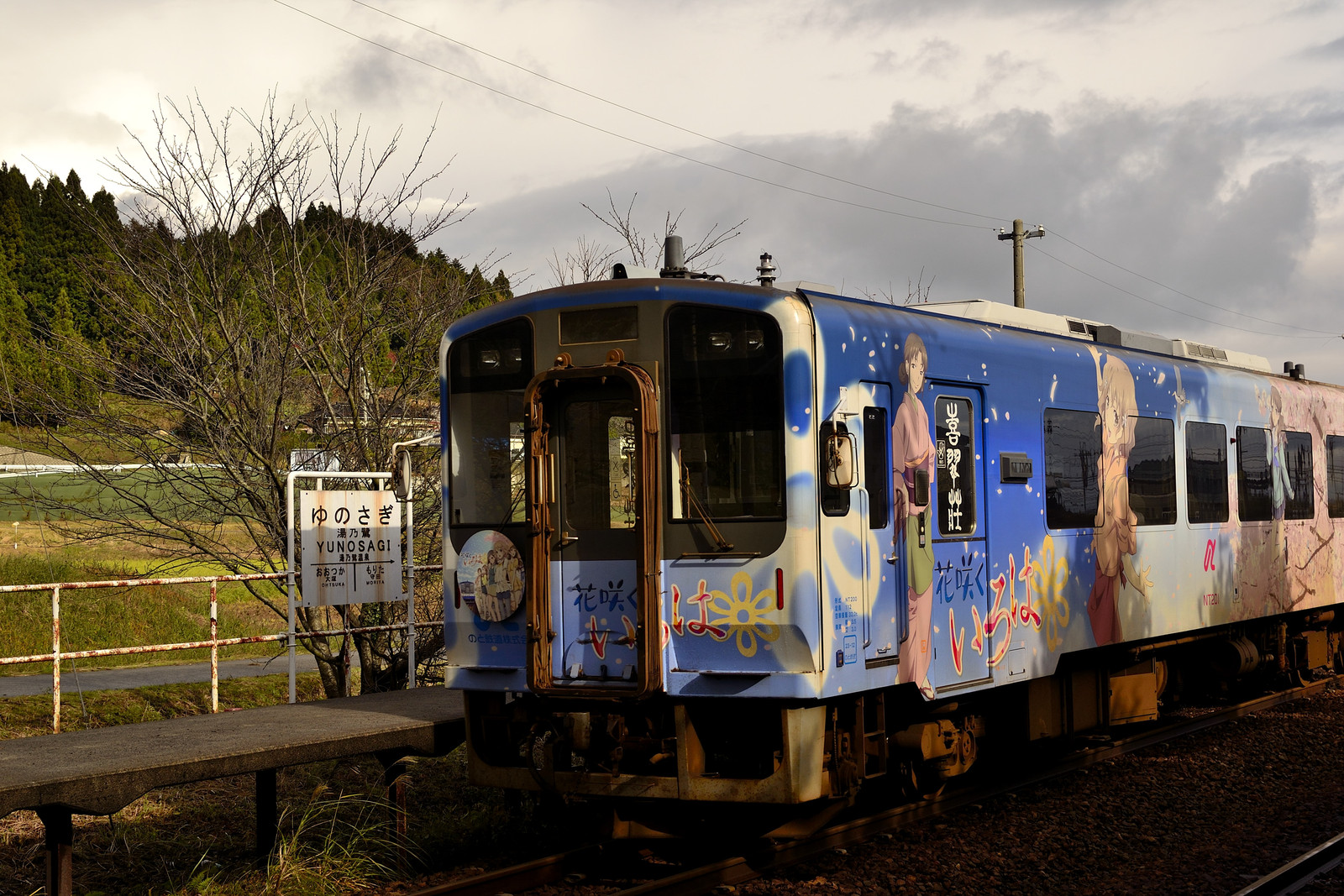 「湯乃鷺駅」の駅名標と、走り去る「花咲くいろは」ラッピング列車。私はこの列車の折り返しに乗車、車内放送でアニメの出演者の声?で駅案内をしてくれるのだが、一芝居うった後に早口で紹介するので私の様なおっさんには何言っているのかさっぱり分からなかった。