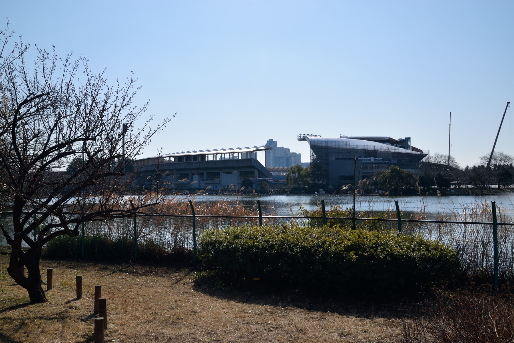 池の向こうは等々力競技場・・この2月に改築工事が終わり、新しいメインスタンドが完成の予定。