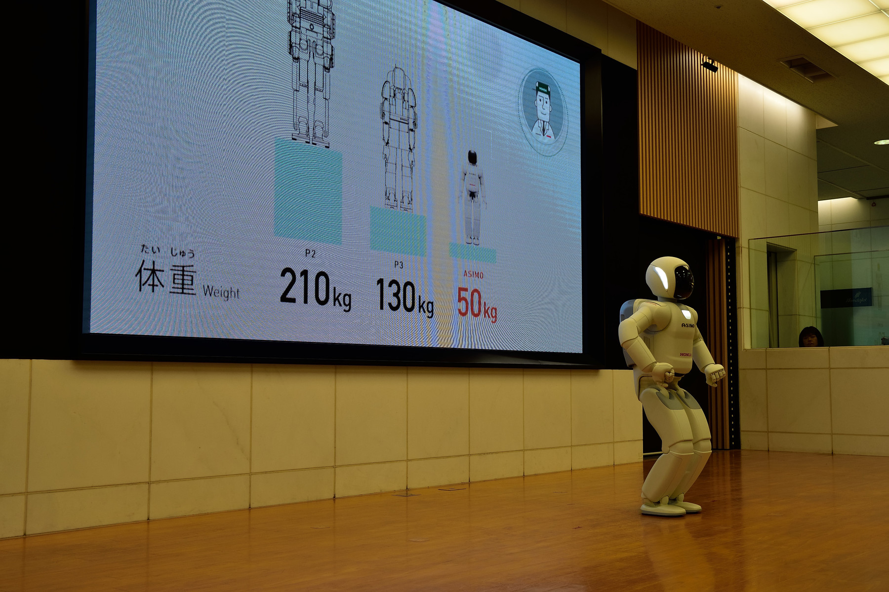 アシモはその技術の進化に伴い、どんどん小さくなっています。ちなみに後ろに出ている体重210キロのP2アシモを含め過去の巨大なアシモはこちらです ↓