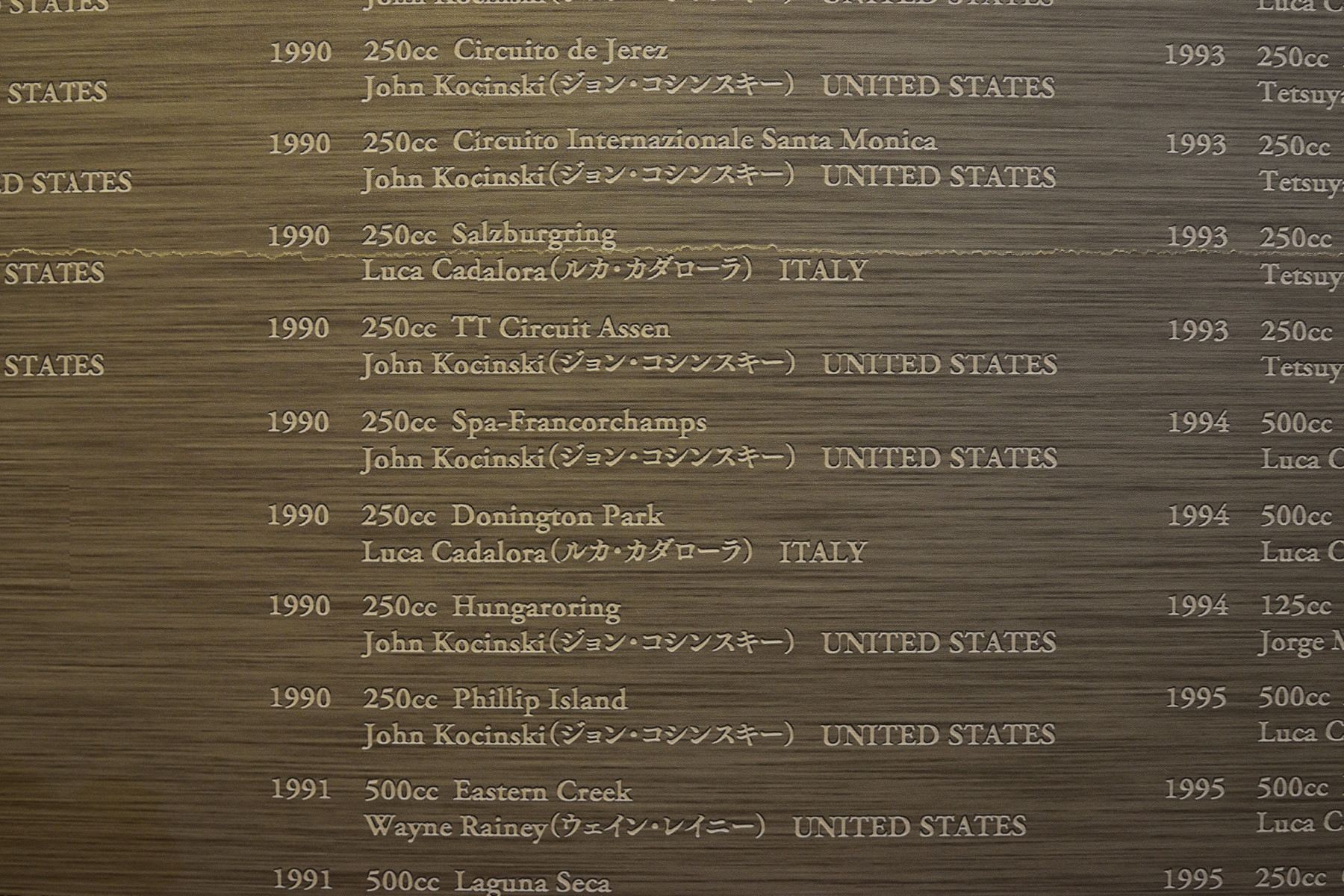 ここにも何ヵ所か刻まれているジョン・コシンスキーというライダー。250でも500でも何に乗っても速いけど、それ以上に性格が扱いにくくてレース関係者に嫌われるというライダーでした。最後はスズキに移籍したけど勝てないマシンにイラついたあげく、エンジンわざとぶっ壊してクビになりました・・・