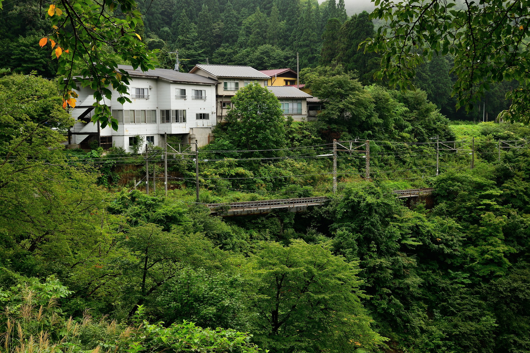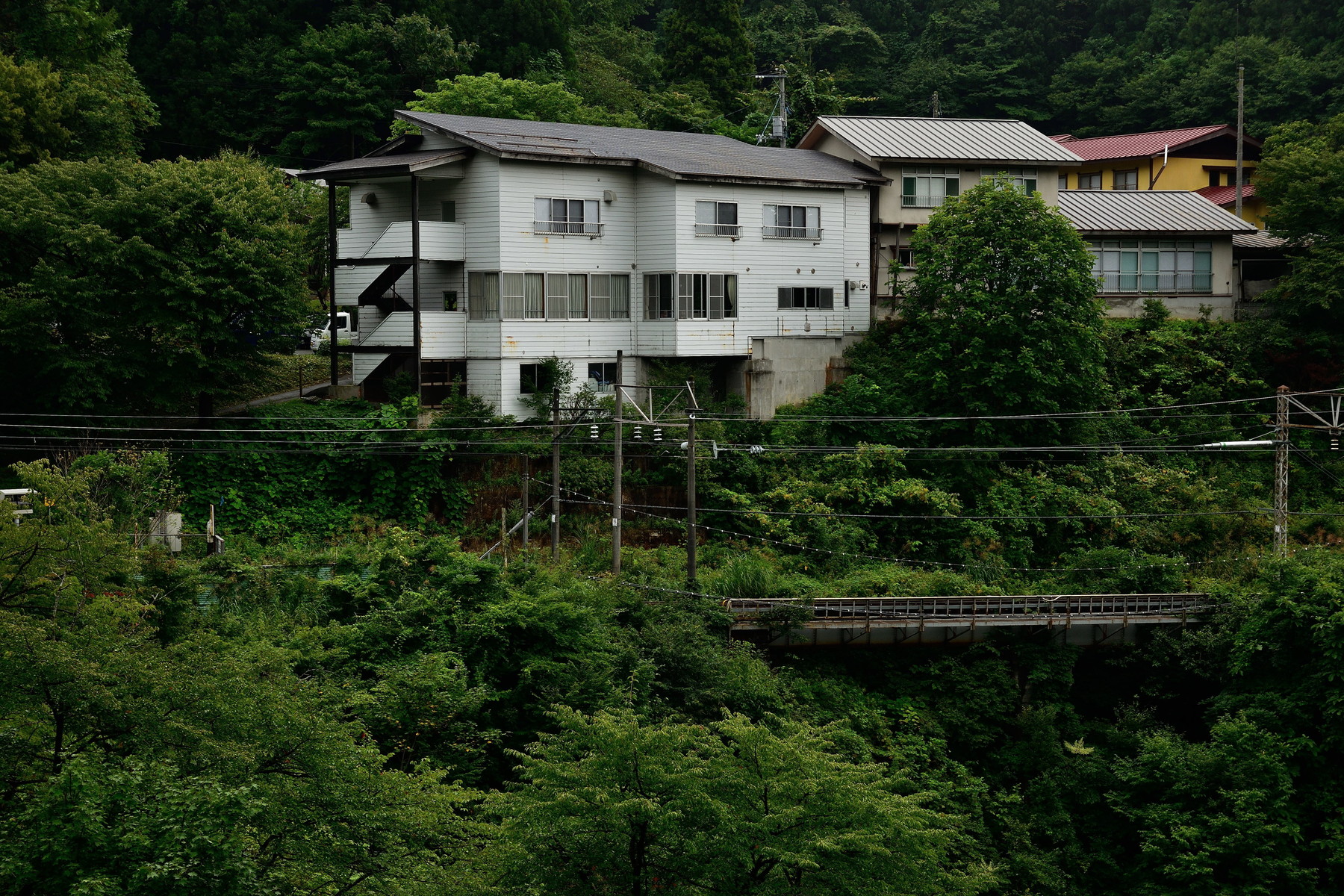 線路を渡って反対側から見るとこの駅に一番近い「藤花山荘」はもの凄い崖っぷちに建っています。