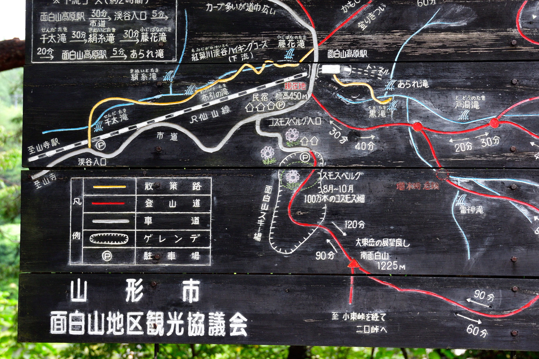 この看板の裏側から山への散策路がありました。ここから5分の場所に「あられ滝」があるそうですが、この日は朝から雨が降っていて足場が悪いと判断して行く事を検討すらしませんでした。