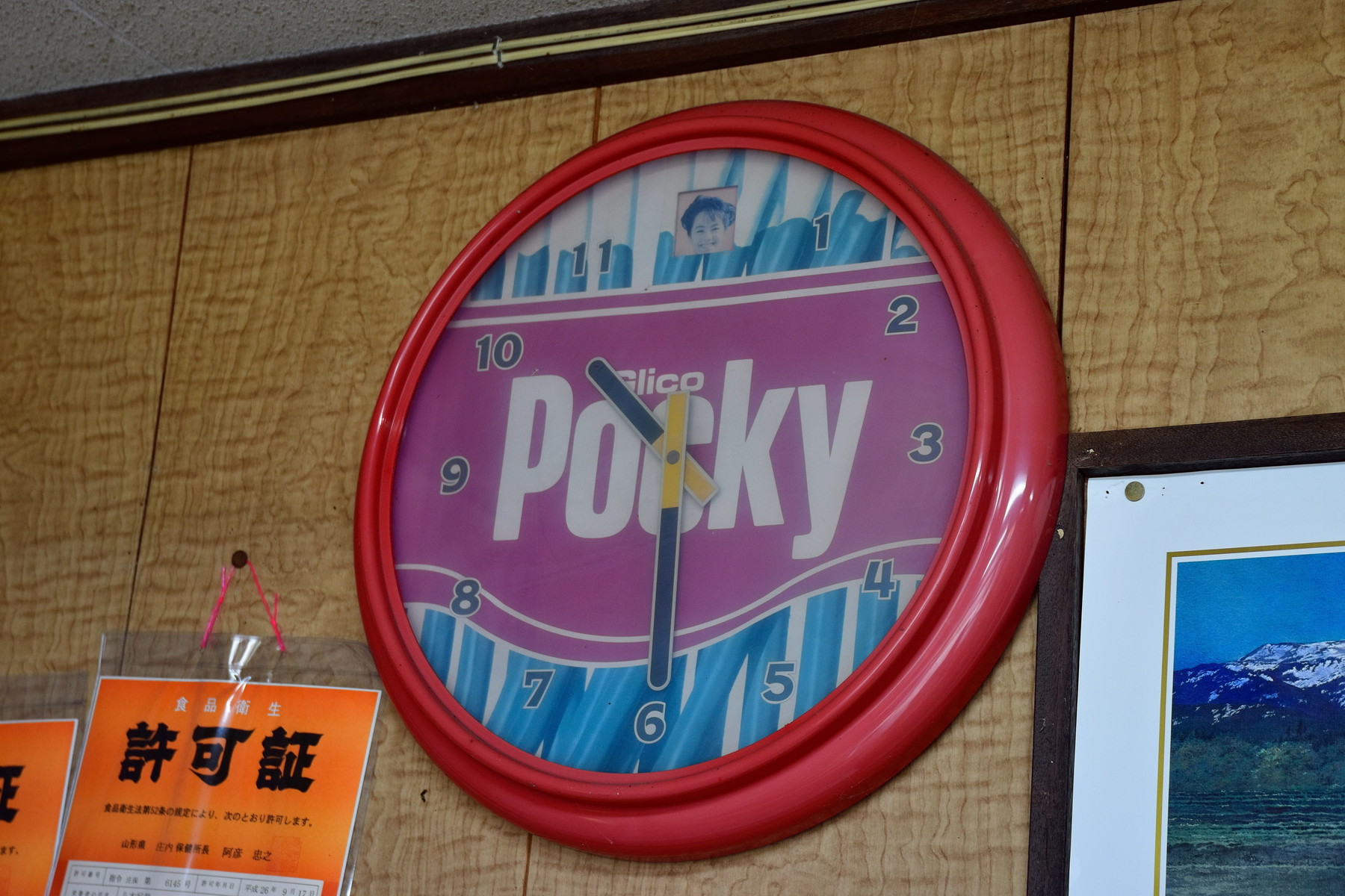 ポッキーの壁時計・・この子供っぽい人は牧瀬里穂でしょうか?1990年代前半かな?