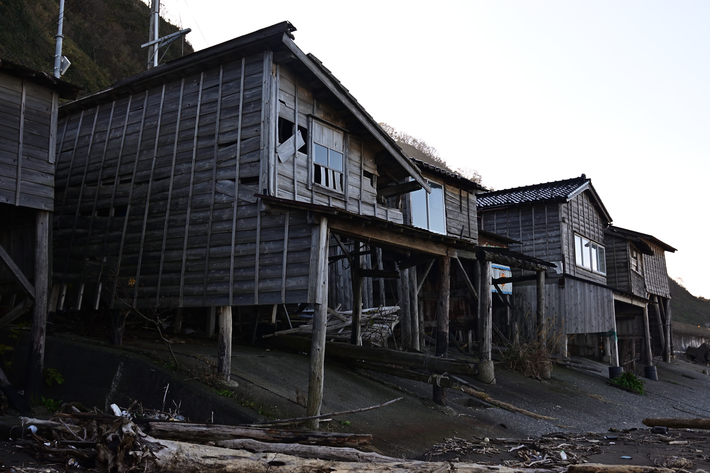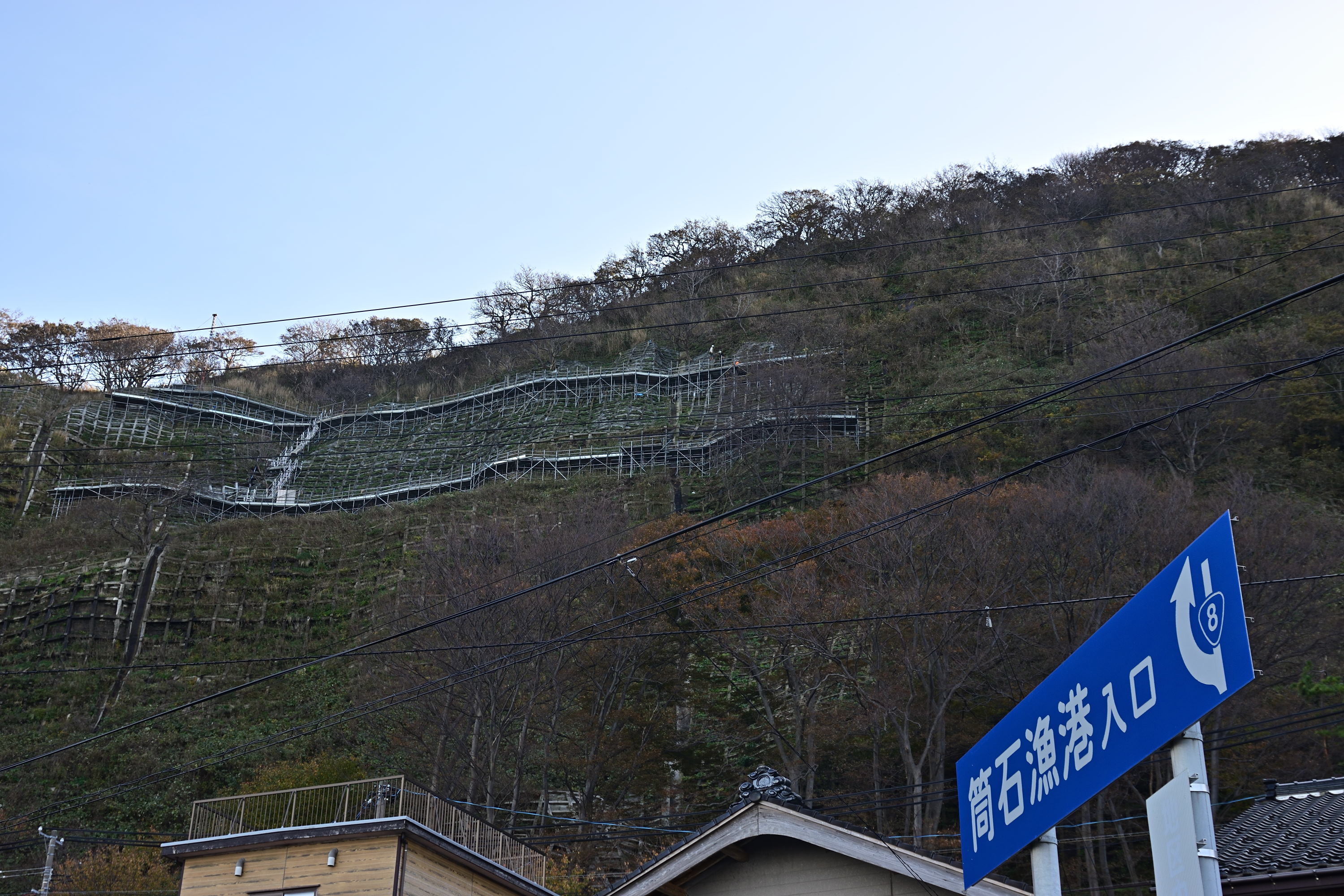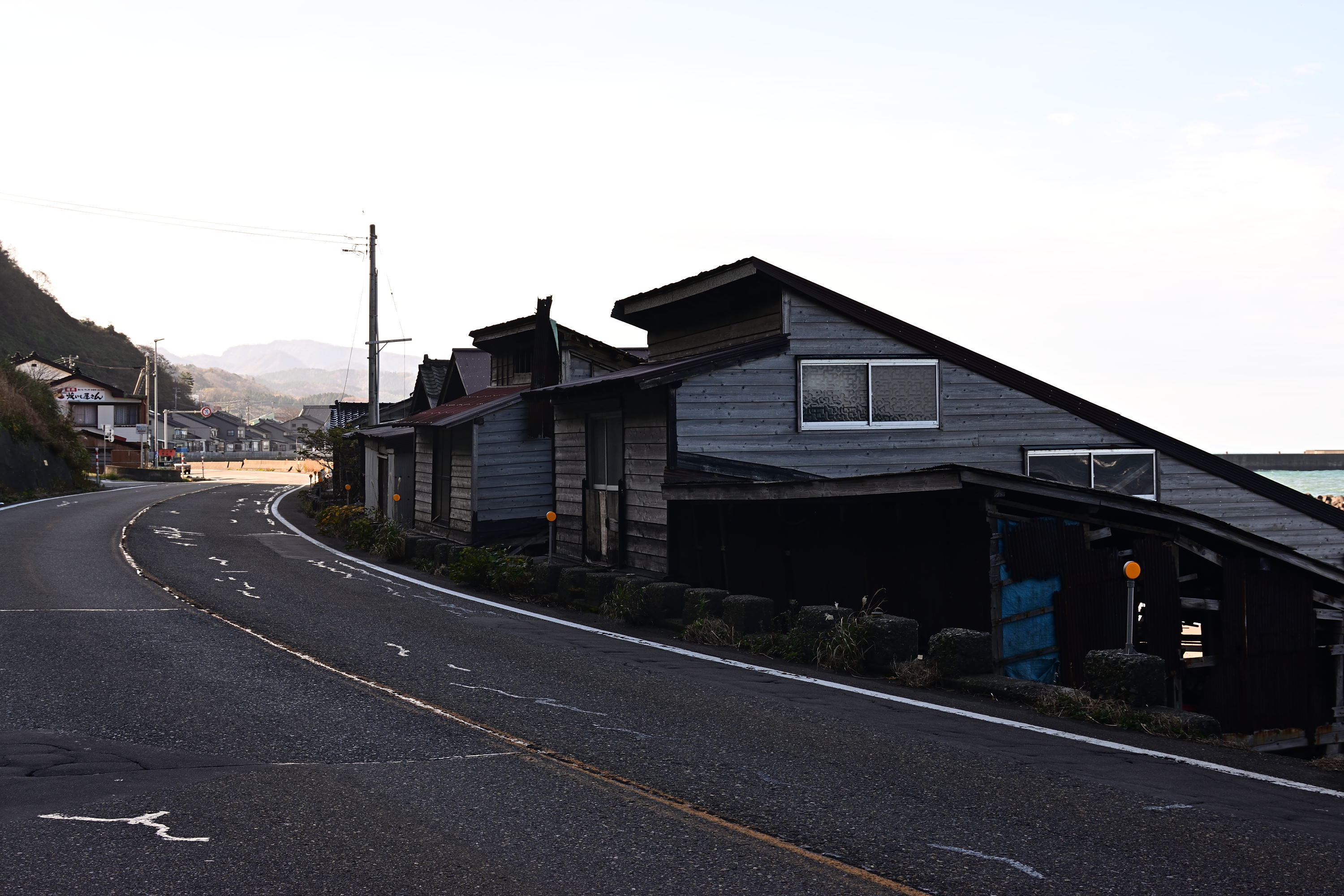ということで「どうやらこれでは無さそうだぞ」と、トイレ休憩ついでにちょっと歩いて北の方を見てみると、さっき歩いて往復した筒石の集落の向こうにそれっぽい建物群がうっすらと見えました。集落行った時にちゃんと海に出て左右を見渡せば良かったです。結果的にこの集落を2往復して列車も一本見送る事となりました。