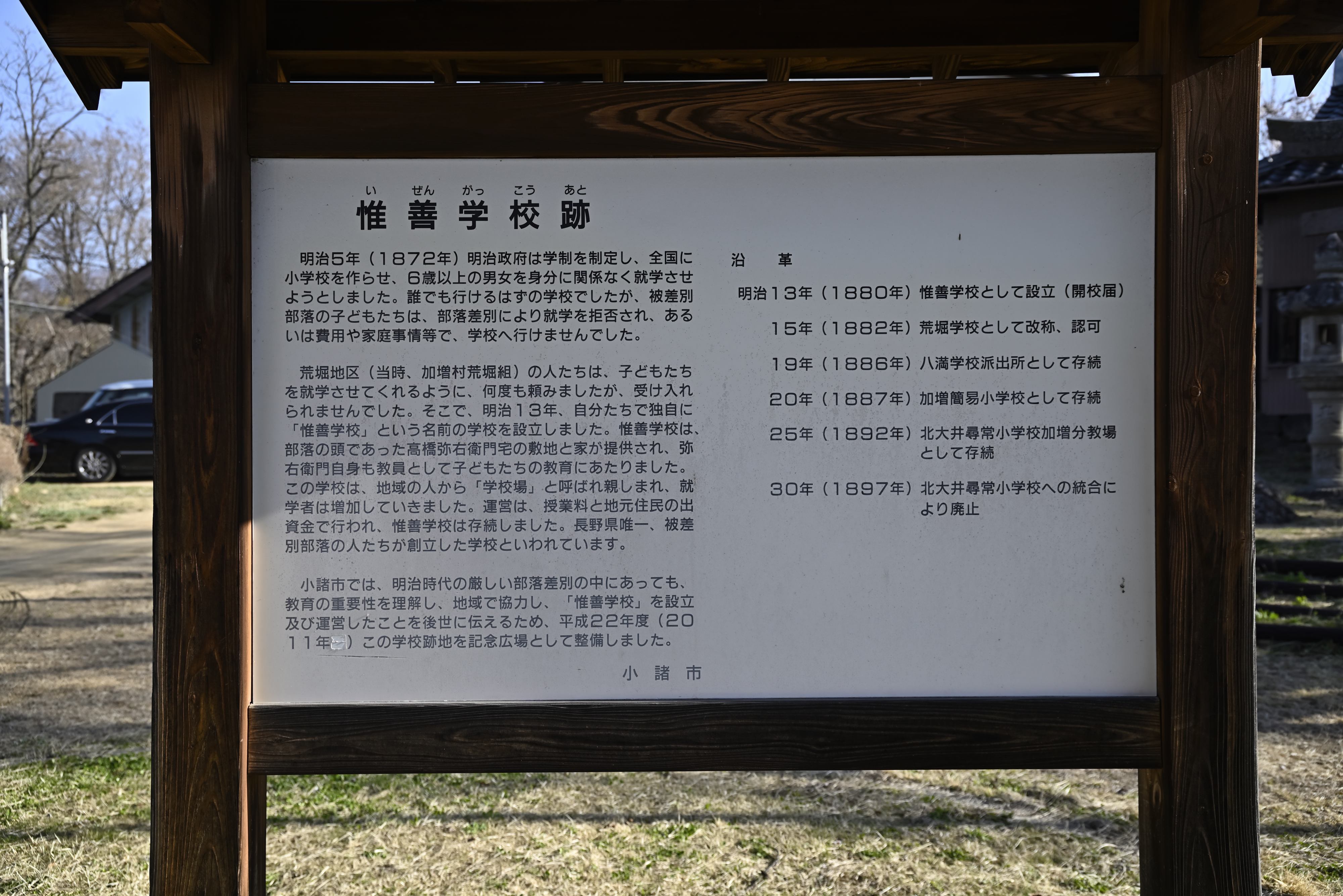 この惟善学校は説明書きによると、1872(明治5)年の学制で各地に学校が創立されたが、被差別部落の子どもたちは差別により学校に行くことができなかったことから、部落の人びとが独自に1880(明治13)年につくられたもの。という事です。