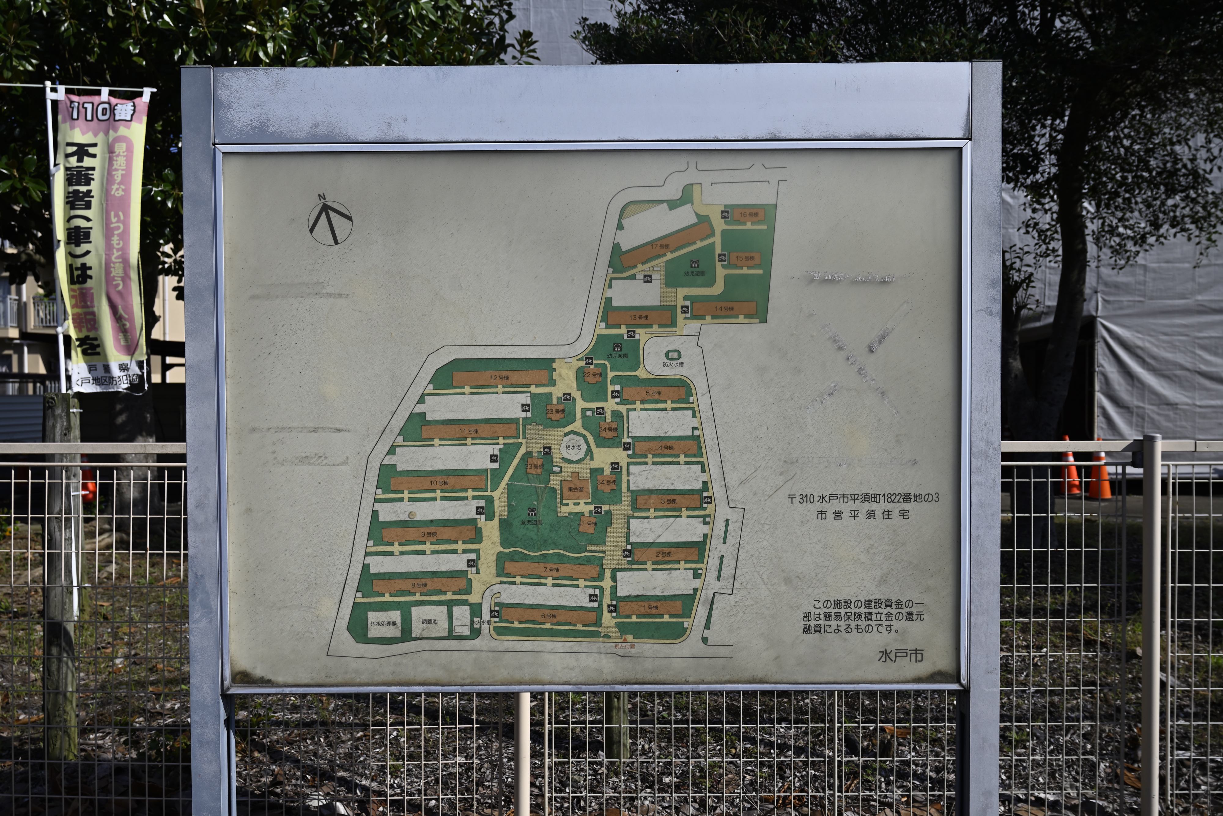 お次の水戸市営六番池住宅の案内図はもう何が何だか・・・昭和55年竣工です。WEBを見ると間取りは約57㎡・60㎡で3DKです。DK以外の3部屋は和室という時代を感じる間取りでした。